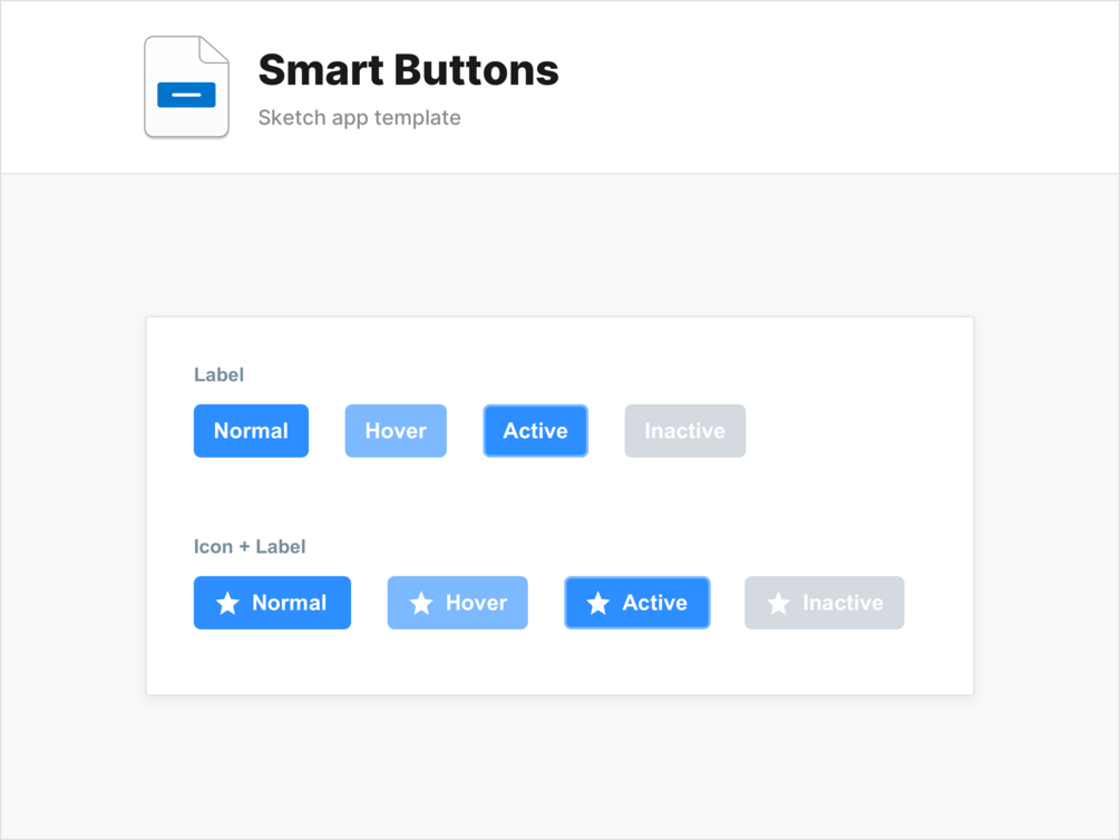 The file includes two types of buttons: with and without an icon, both made of the most popular Sketch features, such as smart layout, library styles, and overrides.