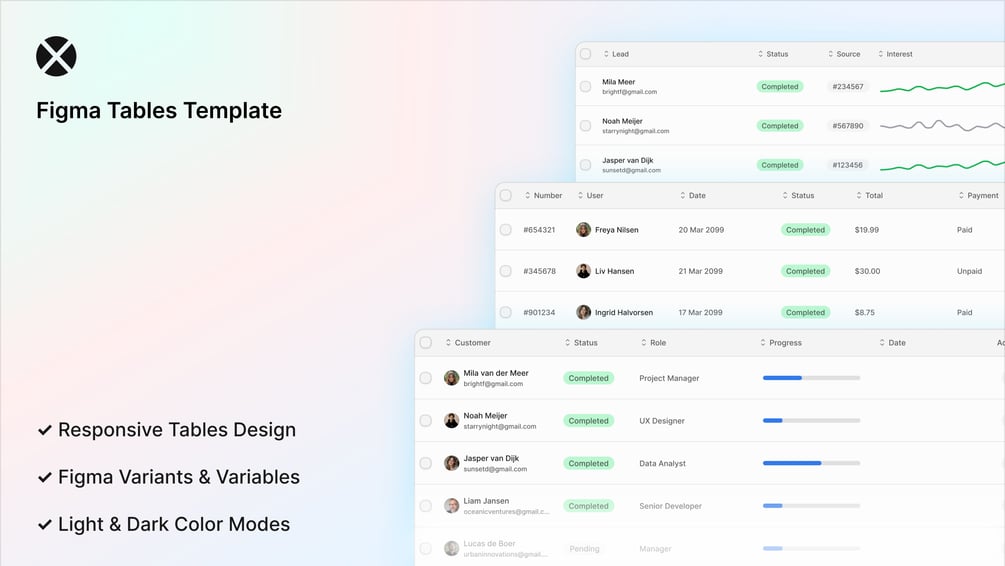 With this Table resource, you'll be able to create fully responsive and dynamic tables in Figma. The file includes an advanced approach to building tables using variable mapping, enabling fewer variants in your Figma design system.