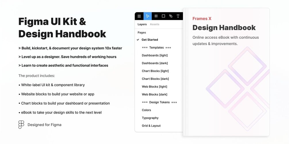Frames X UI Kit is the one Figma design system and Handbook that will skyrocket your career and save you thousands of hours designing your project's UI.