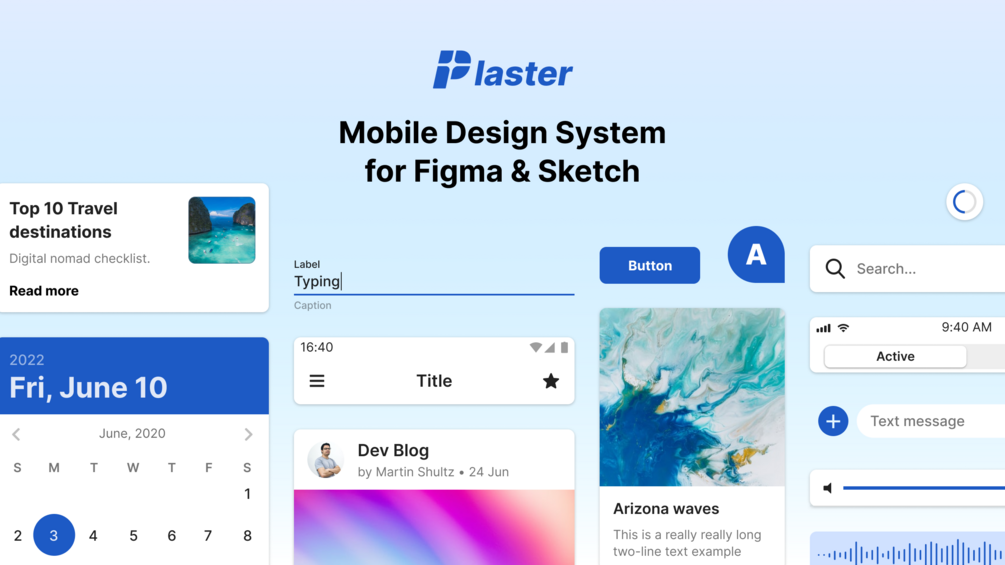 Huge component library. Plaster includes 1.6k+ components for Android and iOS, tuned to perfection, and ready to be used to create professional mobile application design.